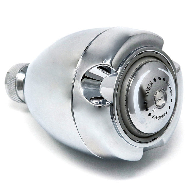The Niagara N2915C-V Earth Spa shower head features an efficient 1.5 gallons per minute flow rate. This model provides three distinct spray settings: a powerful nine-jet spray, a standard shower, and a combination of both. The design includes a built-in volume control valve that allows users to pause water flow while soaping up, promoting water conservation and energy savings.