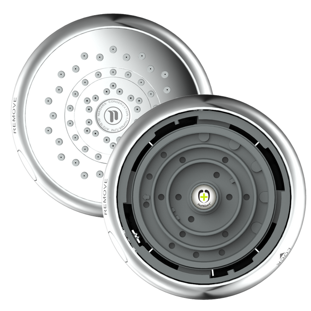The Niagara N9415CH Healthguard shower head features a removable antimicrobial faceplate for easy maintenance. This wall-mounted fixed shower head offers five spray settings and operates at a flow rate of one point five gallons per minute.