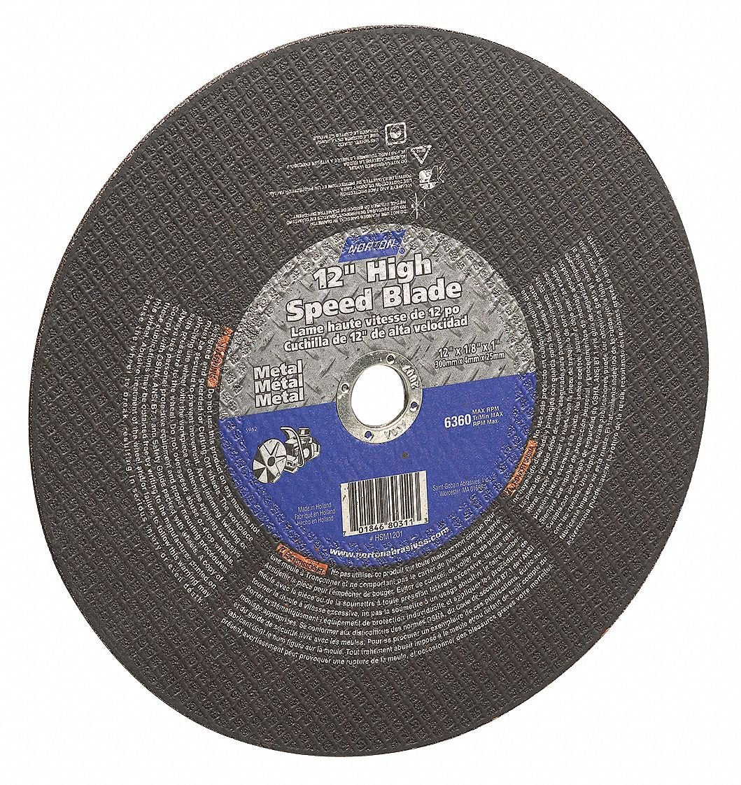 The Norton 66252837838 is a twelve-inch type 1 cut-off wheel made from aluminum oxide. This wheel is designed for cutting ferrous metals, gray iron, stainless steel, and aluminum. It features a twenty-millimeter arbor size and has a thickness of one-eighth of an inch. The high-speed rated design allows for a maximum of six thousand three hundred sixty revolutions per minute. This makes it suitable for various cutting applications.