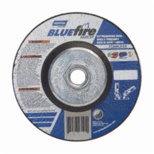 The Norton 66252843191 BlueFire INOX/SS zirconia alumina Type 27 grinding and cutting wheel is designed for use with right angle grinders. This wheel offers a long lifespan, outlasting standard aluminum oxide wheels by two to three times. It is made to reduce the risk of rust and corrosion with less than 0.1 percent iron, sulfur, and chlorine content, making it safe for stainless steel applications.