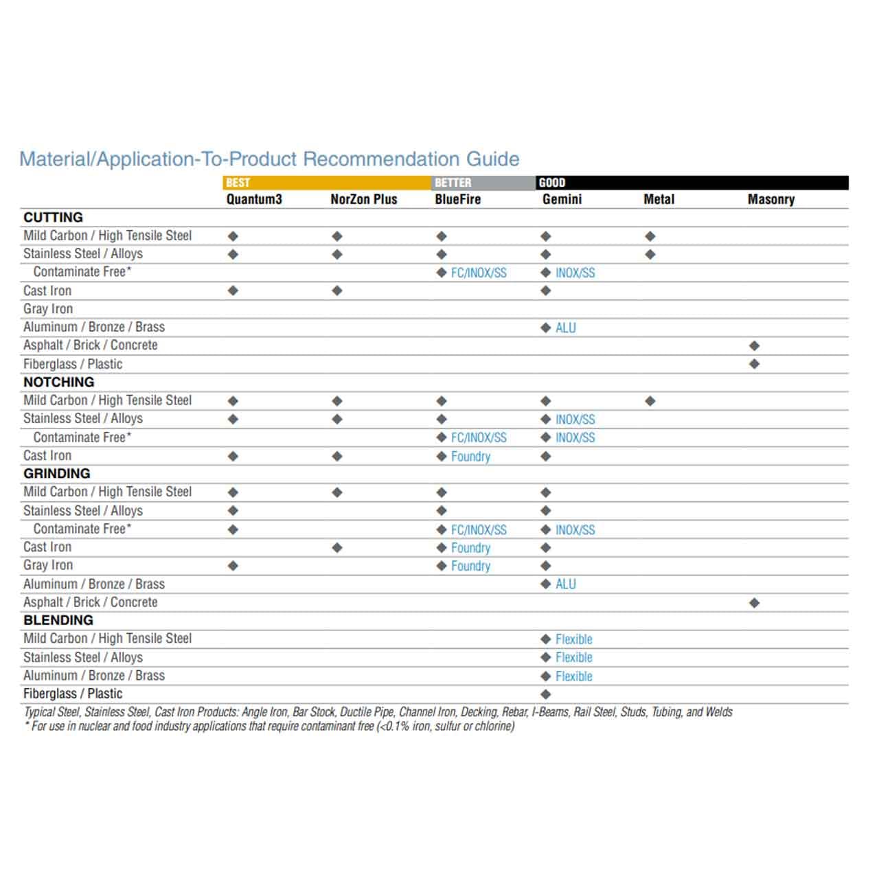 The Norton 66252843331 features NorZon Plus SGZ CA/ZA grinding and cutting wheels designed for industrial use. These wheels are suitable for cutting and grinding applications on various metals including 400 series stainless steel, carbon steels, and cast iron. The recommended cutting angles enhance efficiency in operations, allowing users to choose a 90-degree angle for cutting-off and notching or a 30-degree angle for cleaning pipes and weld beads.