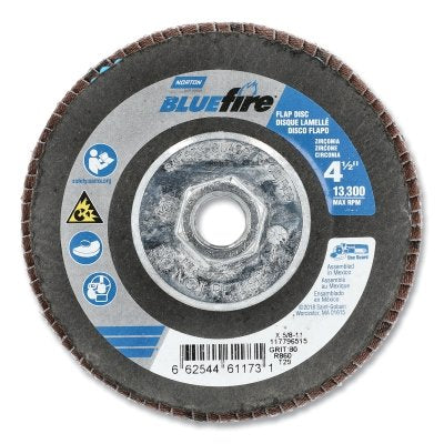 The Norton BlueFire 66254461173 is a coarse grit arbor thread fiberglass conical flap disc. This product features high-performance zirconia alumina abrasive, providing effective cutting and a longer lifespan compared to standard zirconia discs. The lightweight fiberglass and resin backing absorbs vibrations, enhancing operator comfort during use.