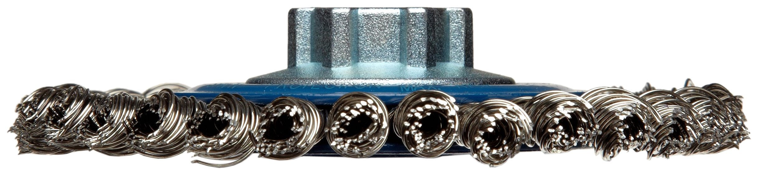 The Norton Stringer Bead Knot Wire Brush with MPN 69936653351 is suitable for various cleaning tasks. It features stainless bristles and is designed for use with right angle grinders. This wire brush is ideal for brushing joints, cleaning cracks in concrete and asphalt, and preparing expansion joints. The product has powder-coated and color-coded hubs that resist rust, minimizing cross-contamination. Red hubs are recommended for steel applications while blue hubs are suitable for stainless steel applications.