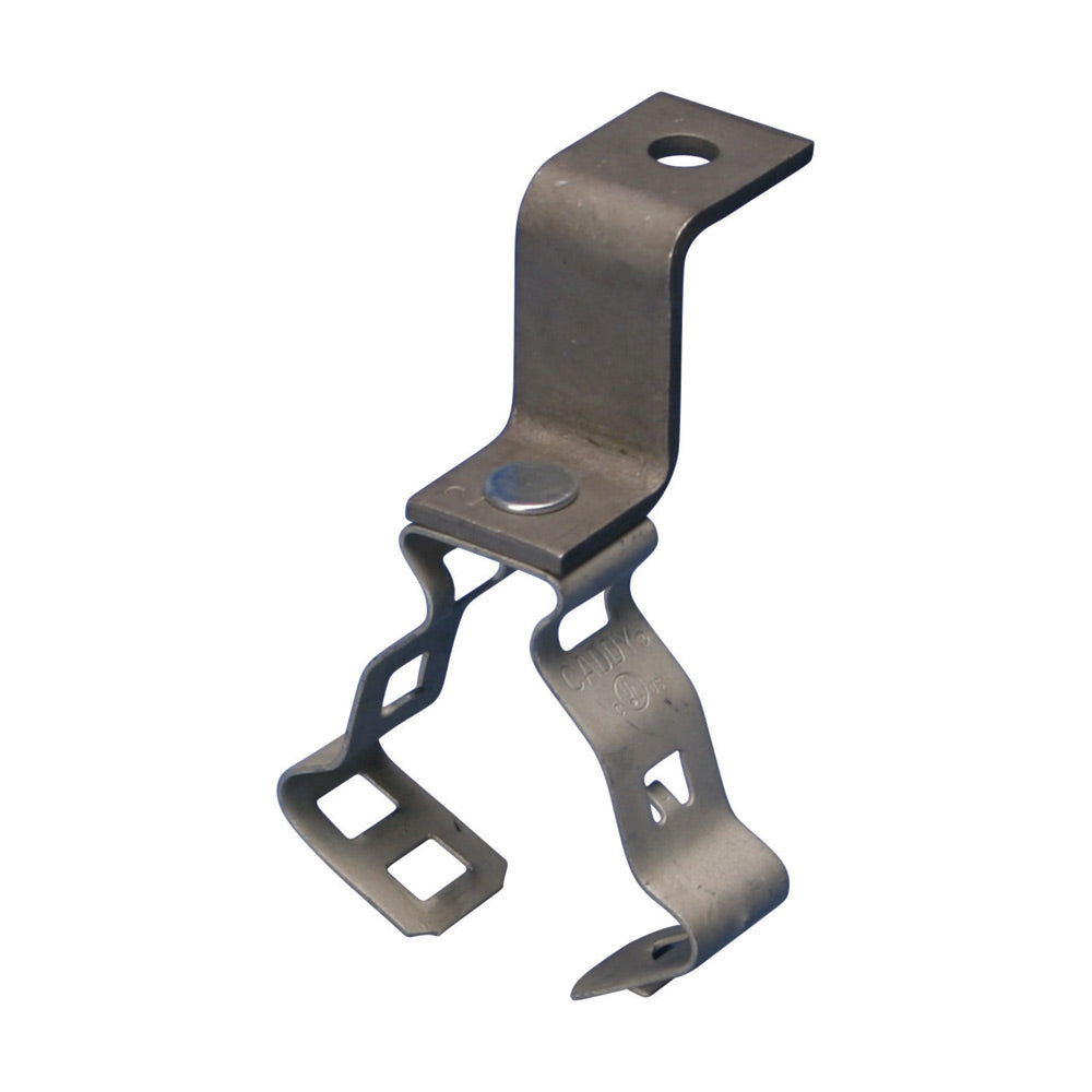 The nVent CADDY 812MCPNAM is a conduit to deck angle bracket designed for use with half inch and three-quarter inch EMT conduit. This steel bracket is essential for electrical fastening and aligns with datacom needs. It supports conduit or pipe neatly under the roof decking to minimize potential damage from nails or screws.