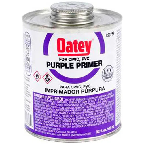 The Oatey 30756 is an 8 oz. purple primer designed for use on PVC and CPVC pipe and fittings. This primer effectively removes surface dirt, grease, and grime while softening the pipe surface. This action allows for a fast and secure solvent weld. Its purple tint provides a visual indication that priming has occurred, which is essential for plumbing codes that require verification of primer application. The product is NSF-listed and complies with ASTM F-656, ensuring adherence to industry standards.