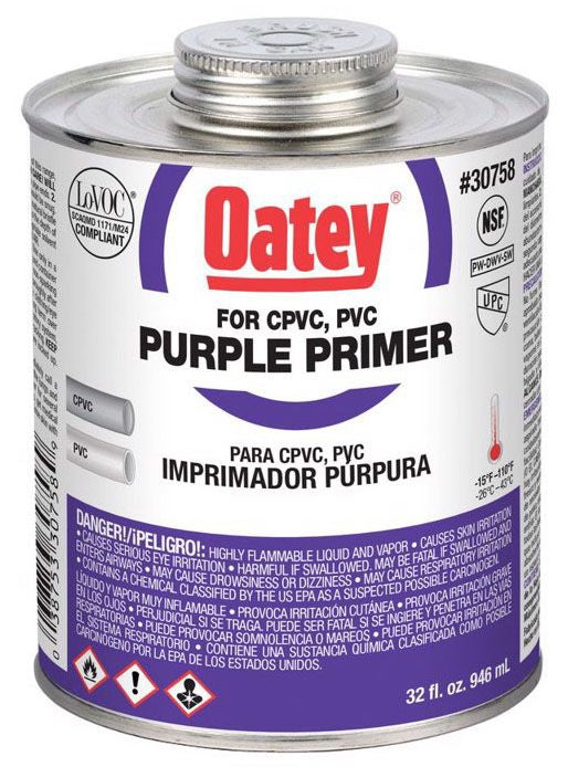 Oatey 30758 is a purple primer for PVC and CPVC pipes and fittings. This primer serves to clean the surface, removing debris and contaminants before solvent welding. It is essential for ensuring a secure bond between pipes and fittings by softening the pipe surface for optimal adhesion.