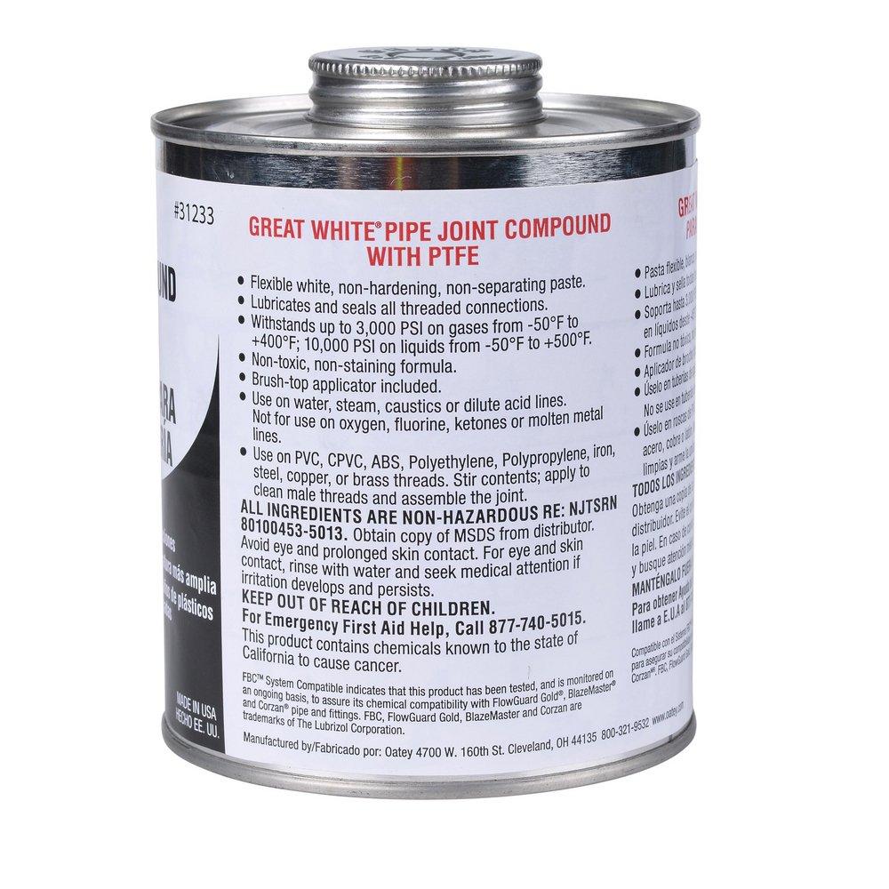 The Oatey Great White 32 oz. White Pipe Joint Compound, MPN 31233, is designed for plumbing professionals. This compound does not harden or separate, ensuring a reliable bond on pipes.
