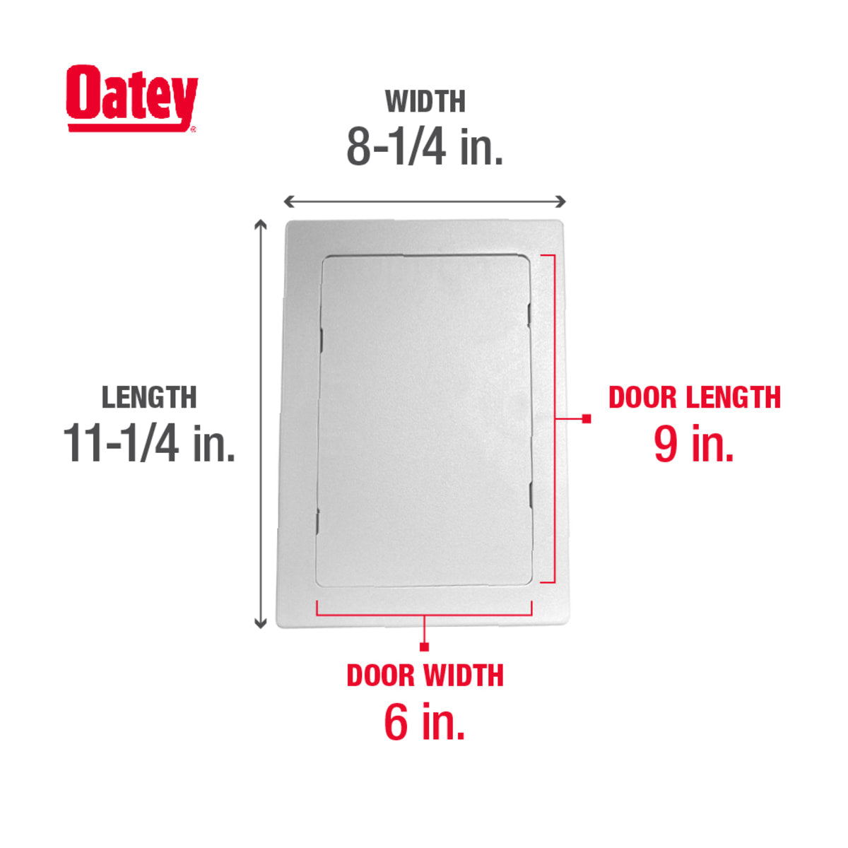 The Oatey 34055 is a nine-inch plastic access panel designed for simple access to plumbing, electrical systems, and other utilities behind walls or ceilings. It is easy to install between wall studs or ceiling joists and can mount flush or on the surface.