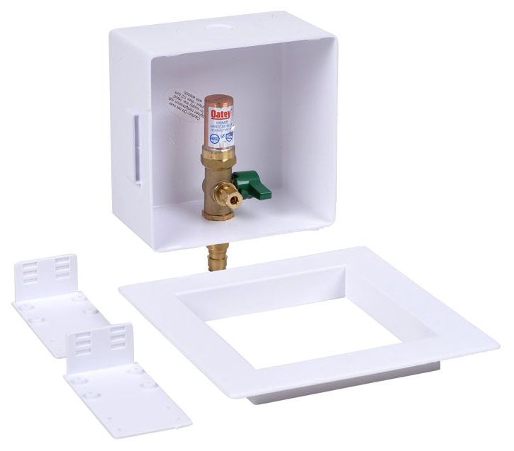 The Oatey F1960 Connection Ice Maker Supply Box, MPN 39150, is designed for reliable water supply and shut-off for ice makers and refrigerator water dispensers. This supply box is made from high-impact polystyrene, ensuring durability during installation.