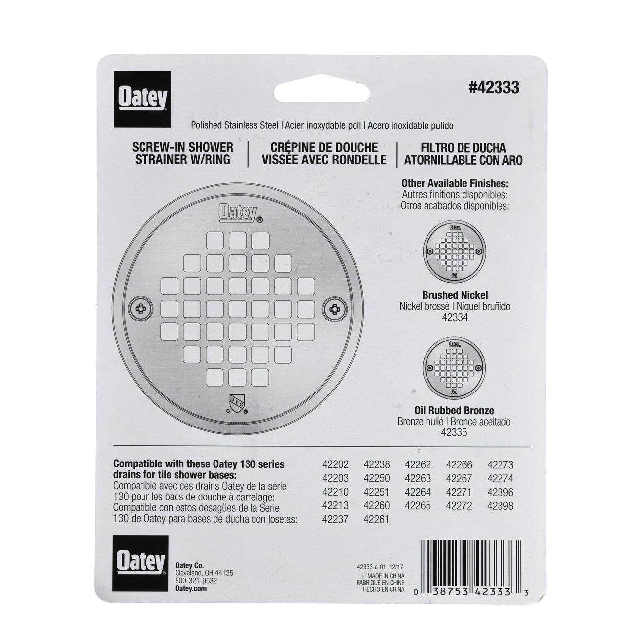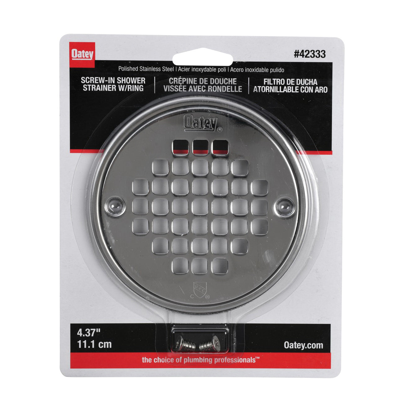 The Oatey 42333 is a round screw-in strainer designed for use with 130 Series drains. This product features a diameter of four point three seven inches and is made from durable 304 stainless steel. It comes with a beauty tile ring to protect grout, ensuring a seamless installation.
