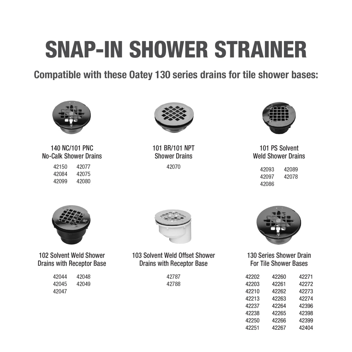 The Oatey Universal 4-1/4 in. Snap-Tite Strainer, MPN 42422, is designed for residential shower drains. This strainer fits any round drain top of four and one-quarter inches. The Snap-Tite feature allows for easy installation and removal, making it simple to clean the drain. Made from durable stainless steel, this strainer provides a modern look for any shower setup.
