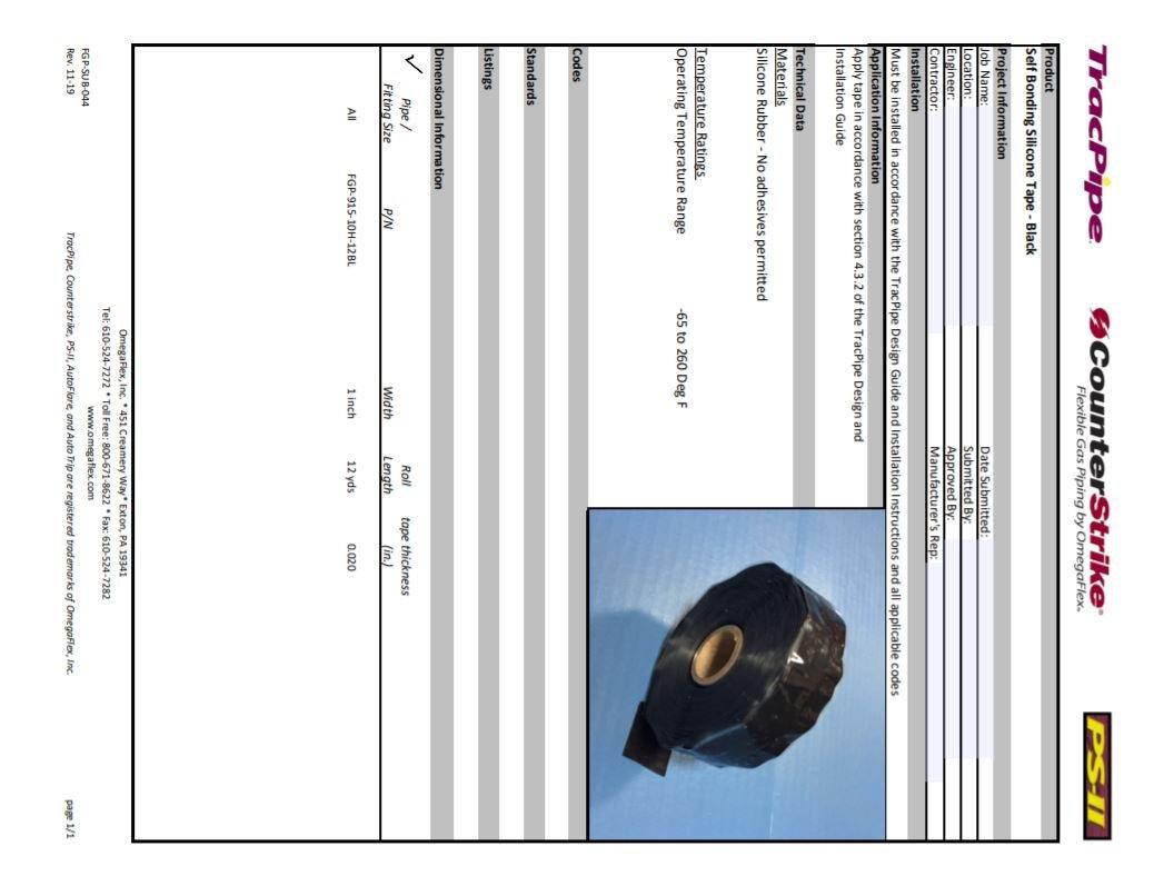 The Omega Flex FGP-915-10H-12BL is a 12-yard roll of black CounterStrike silicone tape. This tape is designed for flexible gas piping systems and provides reliable sealing in various applications.