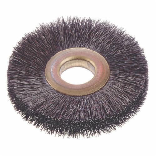 The Osborn 11019 Small Diameter Wheel Brush is designed for effective brushing operations on internal surfaces and hard-to-reach areas. This brush measures one and a half inches in diameter with a face width of seven thirty-seconds of an inch and has a three-eighths inch arbor hole. It features a crimped filament made from carbon steel, suitable for high-speed applications, with a maximum speed of twenty thousand revolutions per minute.