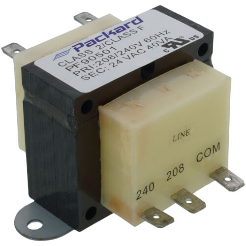 The Packard PF90501 Transformer is engineered for efficient and reliable control in HVAC systems, converting 208/240 volts primary voltage to 24 volts secondary voltage with a capacity of 40 volt-amps. Its compact foot mount design facilitates easy installation in tight spaces.