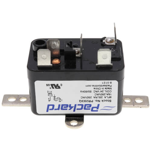The Packard PR293Q is a switching fan relay designed for HVAC applications. This relay operates on a twenty-four volt alternating current coil and can handle an eight amp full load or twenty-five amp locked rotor current at two hundred fifty volts. It is ideal for switching solenoids, fan motors, and similar devices.