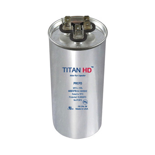 Packard PRCFD705A Titan HD Dual Section Motor Run Capacitor is designed to meet the needs of HVAC professionals. It features a dual-section capability with 70/5 MFD and can operate at a voltage of 440/370. Made with high-quality aluminum and incorporating metalized polypropylene film technology, this capacitor is built to last in demanding conditions.