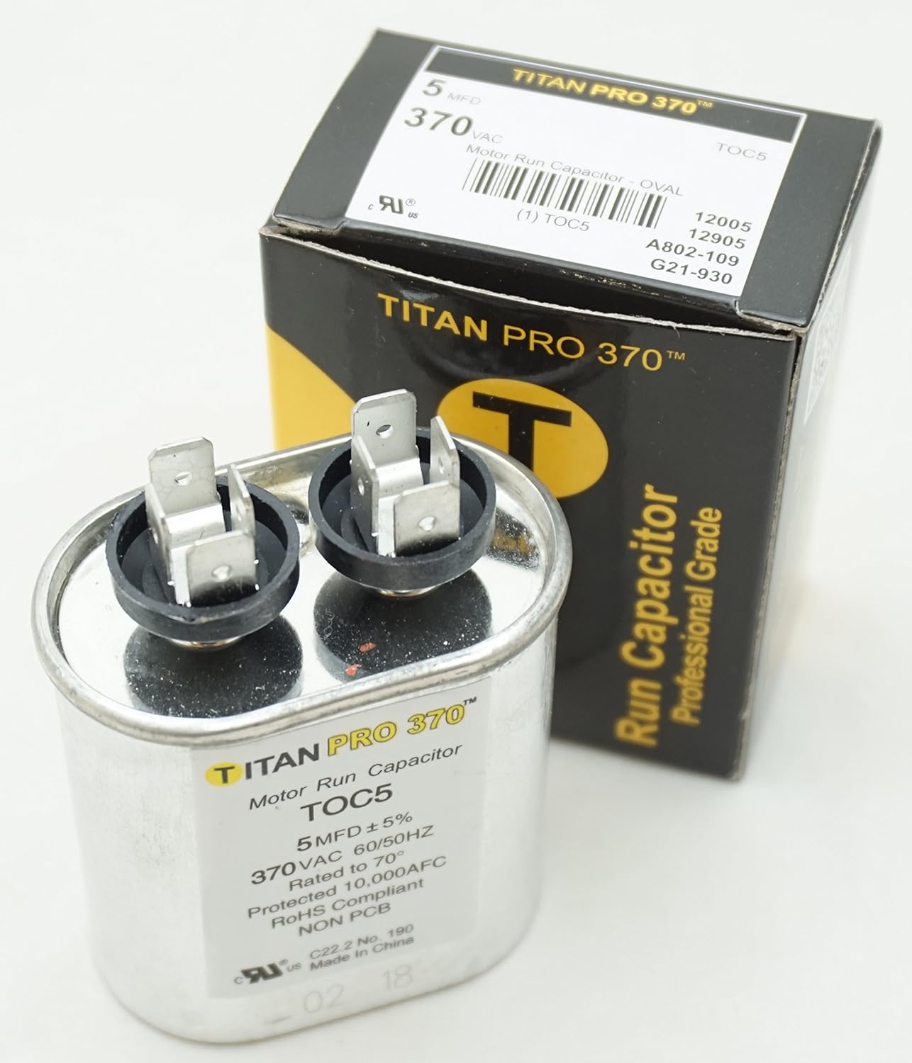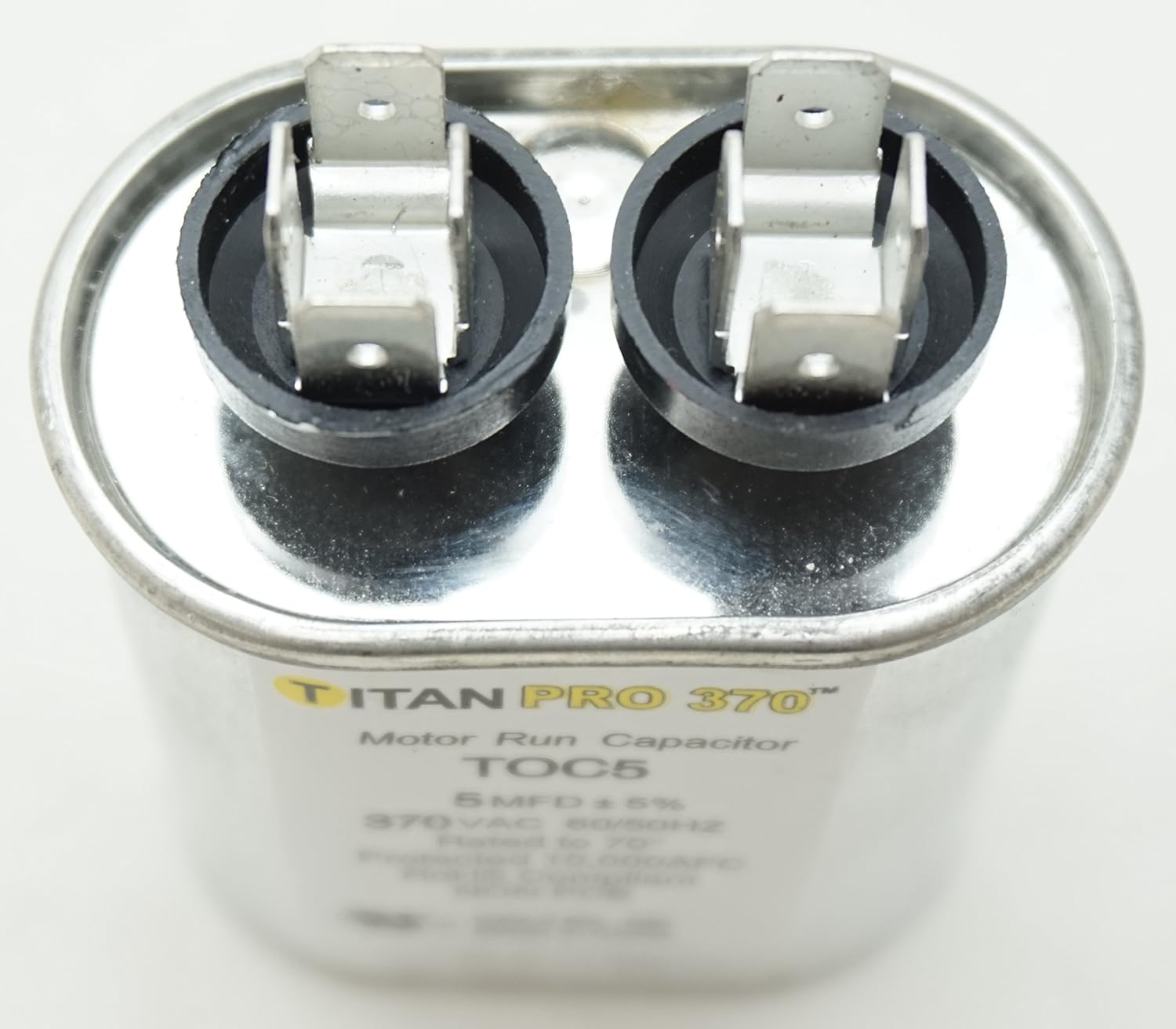 The Packard TOC5 Motor Run Capacitor is designed for reliable and efficient performance in industrial motor applications. This essential component, featuring a capacitance of 5 MFD and a voltage rating of 370V, ensures the smooth operation of motors.