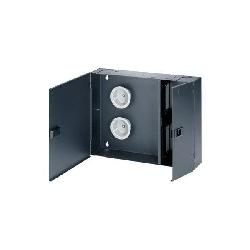 The Panduit FWME4 Loaded Fiber Optic Enclosure is designed for wall mounting and efficient fiber organization. This enclosure holds up to four QuickNet MTP modules, serving as an interconnect or cross-connect point. It is suitable for use in environments where space is limited, ensuring clean and organized fiber distribution.
