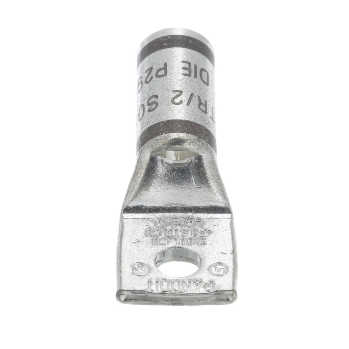 The Panduit LCA4-10-L is a compression connector lug made from tin-plated copper. It works with wire sizes ranging from four to three American Wire Gauge strands. The connector features a one-hole standard barrel and includes an inspection window that allows for visual confirmation of full conductor insertion. This connector is suitable for applications requiring a stud size of ten millimeters.