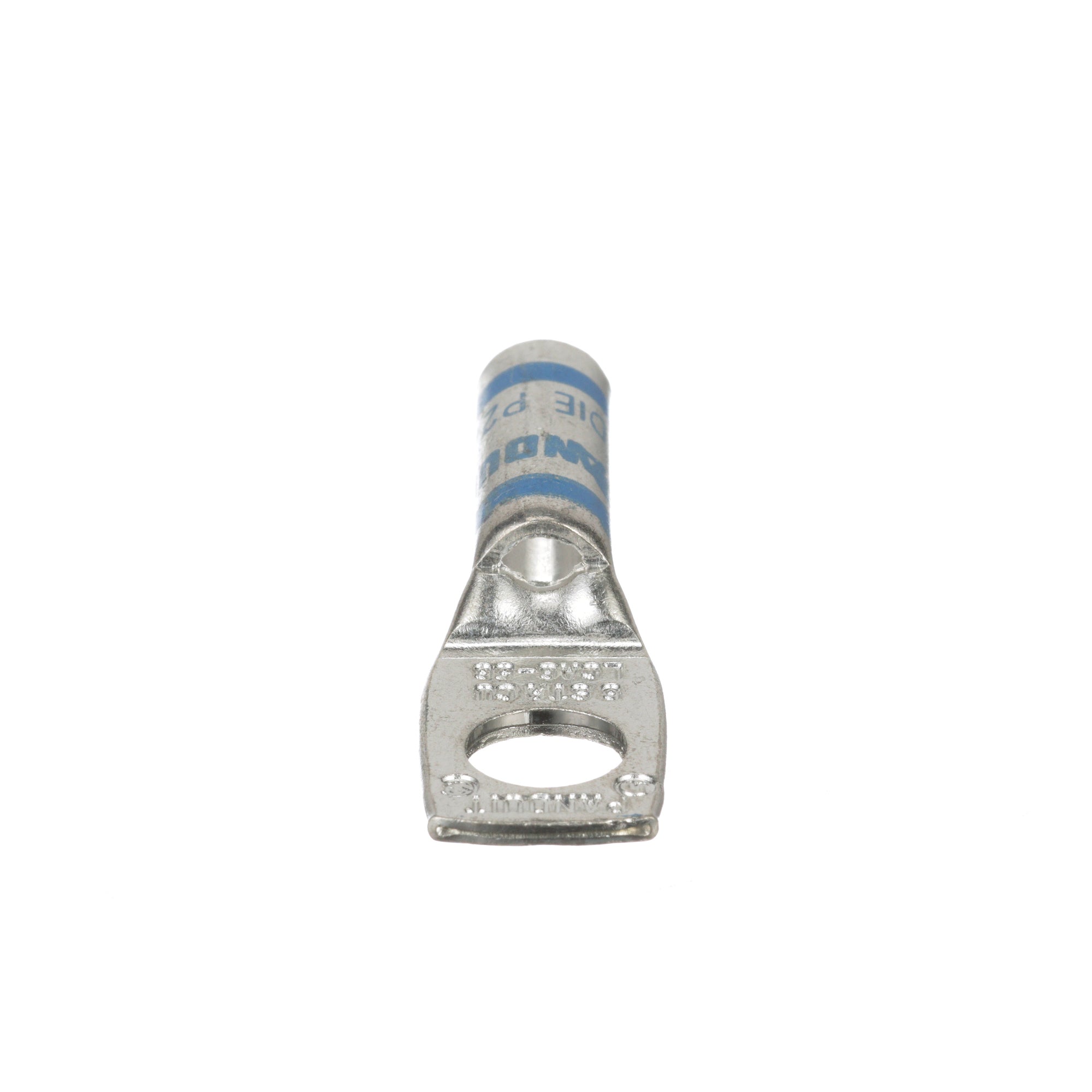 The Panduit LCA6-56-L is a copper compression lug with a standard barrel design. It features an inspection window to ensure proper conductor insertion. The lug is suitable for use with six AWG stranded copper wire and is rated for up to thirty-five kilovolts. The tin plating helps inhibit corrosion and increases the longevity of the connection.
