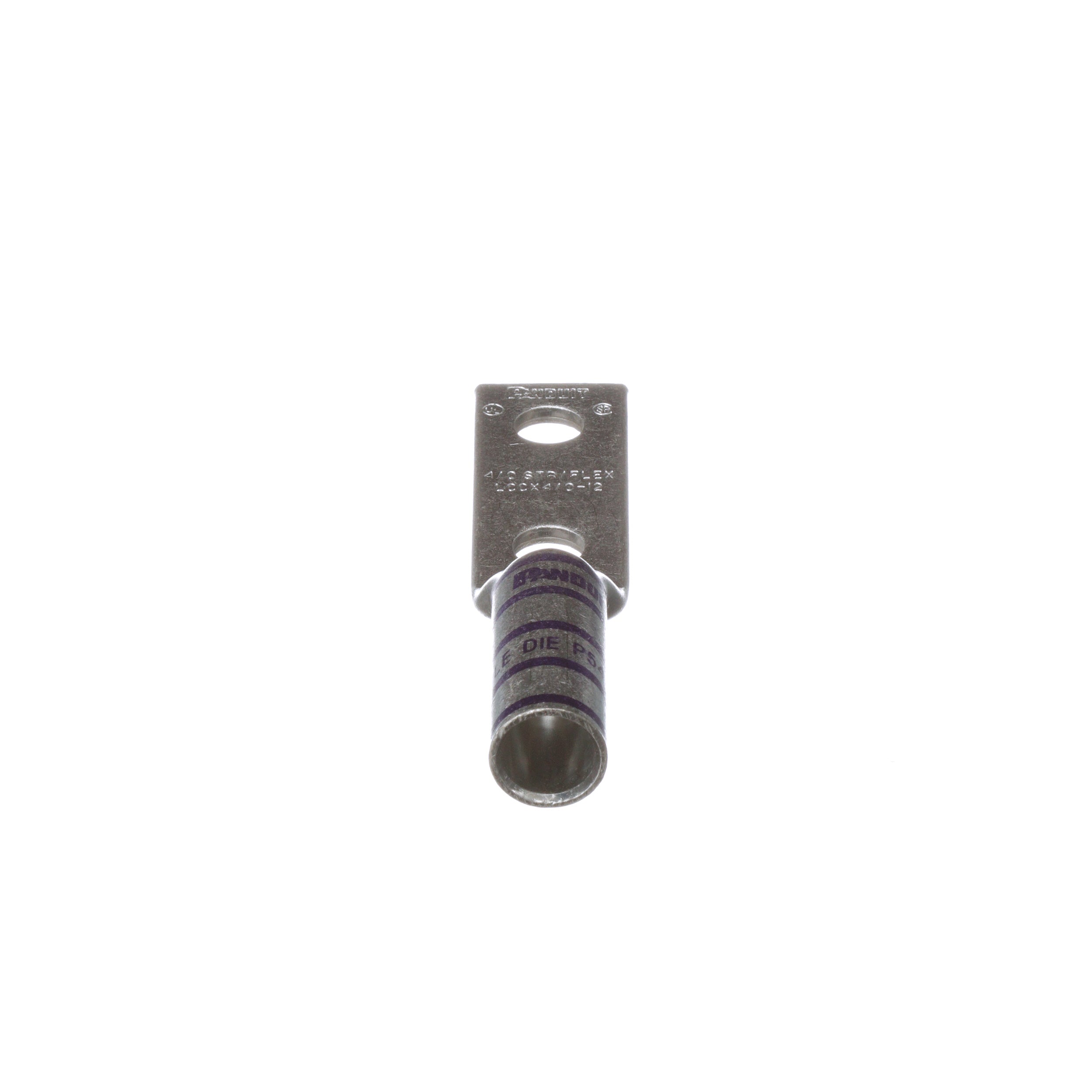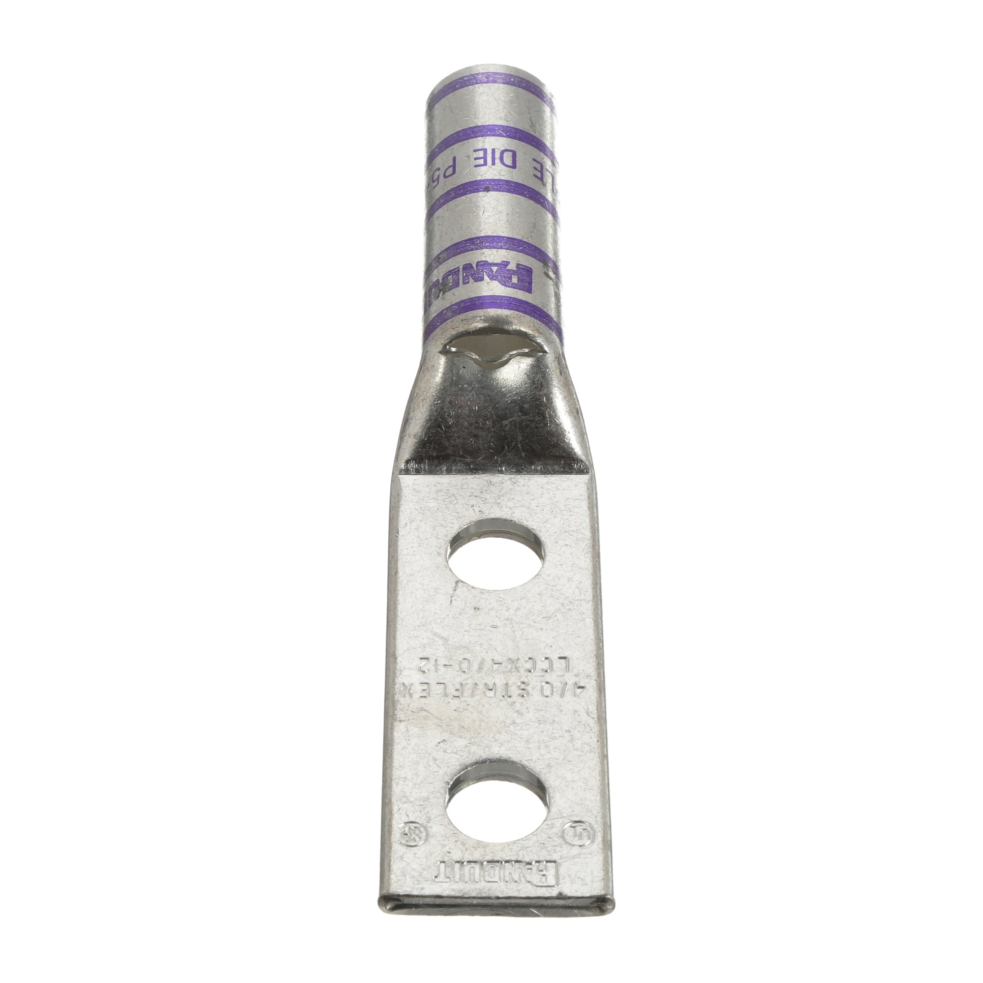 Panduit LCCX4/0-12-X is a copper compression lug designed for use with flexible conductors. This two-hole lug fits a conductor size of four/aught AWG and features a long barrel for optimal crimping performance. The design includes color-coded barrels for easy die index selection. The generous wire entry helps prevent wire strand bending when inserting the conductor. This lug is compact, durable, and ideal for various electrical applications.
