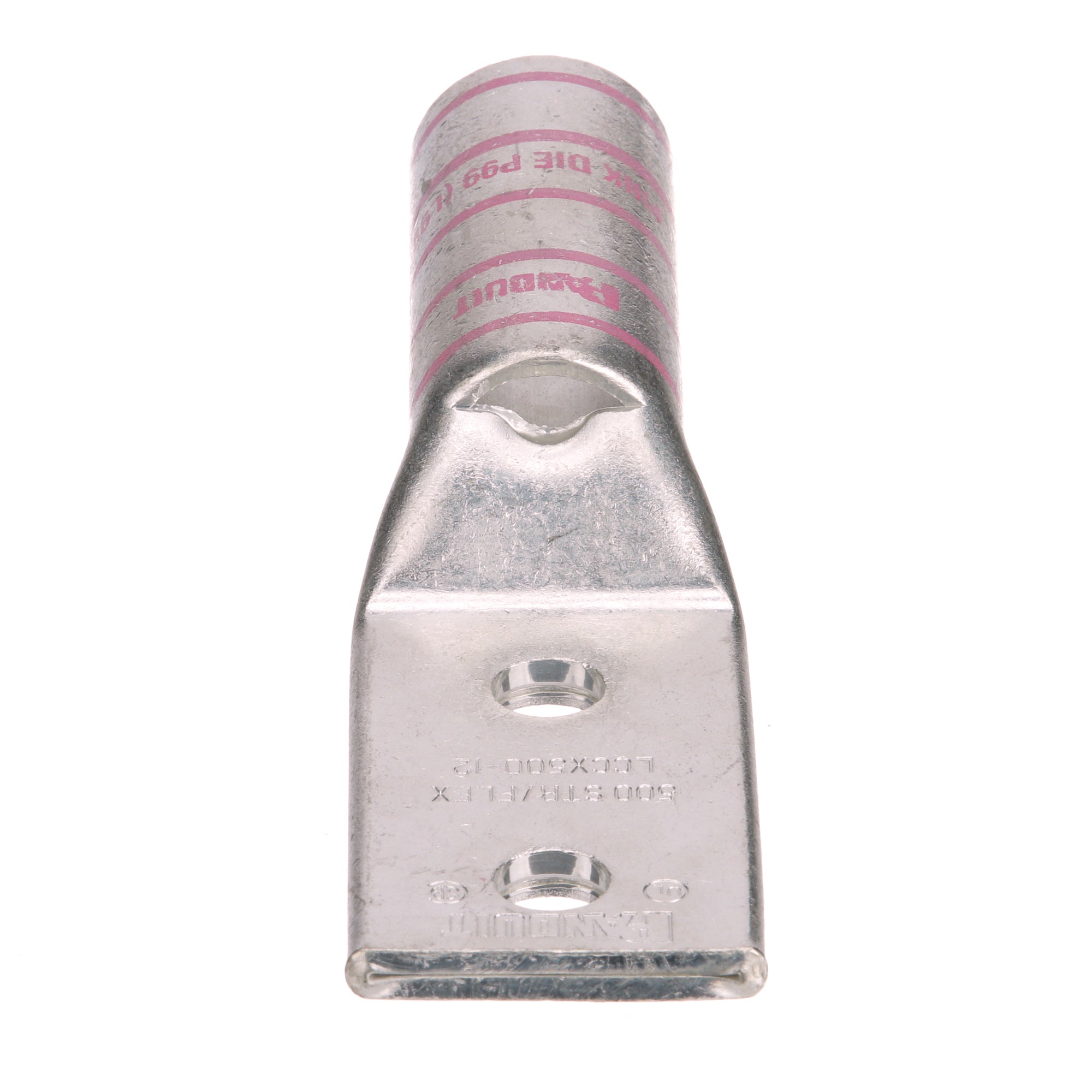 Panduit LCCX500-12-6 is a copper compression lug designed for electrical connections. This compression lug accommodates conductors sized 500 kcmil and features a two-hole configuration for reliable mounting. The long barrel maximizes crimping capability and improves electrical performance. The design includes color-coded barrels marked with Panduit and specified competitor die index numbers for accurate crimp die selection. The generously beveled wire entry reduces the risk of bent strands when inserting the conductor.