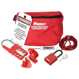 The Panduit PSL-PK-EA ElectricianFTs Lockout Kit is designed for use in lockout/tagout procedures by electricians. This kit includes essential devices for securing electrical circuits and preventing accidental energization during maintenance. It contains items such as a screwdriver, a padlock, and various lockout devices to ensure safety in electrical work.