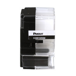 The Panduit R100X150V1M label cassette is designed for labeling applications in various environments. It allows label rotation to any angle, enhancing visibility and ease of use. The label measures one inch by one and a half inches, with a white print-on area measuring one inch by half an inch, protected by a clear overlaminate. This cassette contains one hundred labels, making it suitable for extensive labeling tasks. It can be easily installed on existing wires without the need to disconnect them, ensuring quick application.