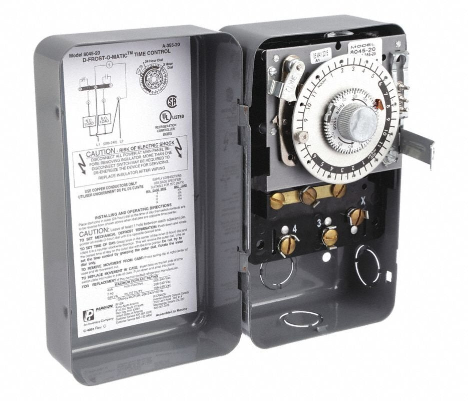 The Robertshaw 8045-20 Mechanical Defrost Timer is designed for commercial refrigeration systems. It operates at 208 to 240 VAC and is ideal for automatic defrosting in freezers and refrigerators. This robust timer accommodates multiple defrosting systems, including electric heaters and hot gas systems.