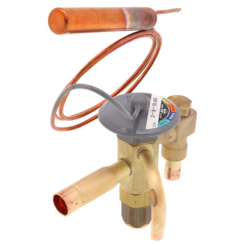 The Sporlan 108624 SBFSE-B-C thermal expansion valve is designed for commercial refrigeration. This valve features an inlet connection of three-eighths inch ODF and an outlet connection of one-half inch ODF. It comes with a thirty-inch capillary tube and is suitable for systems with capacities from one and one-quarter to two tons. The valve is factory tested for leak-free performance.
