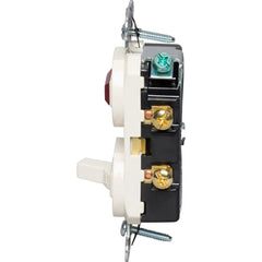 The Pass & Seymour 692LAG is a single-pole combination switch featuring a pilot light. It operates at 15 amperes with a voltage range of 120 to 125 volts. The finish is light almond, designed to blend into various settings.