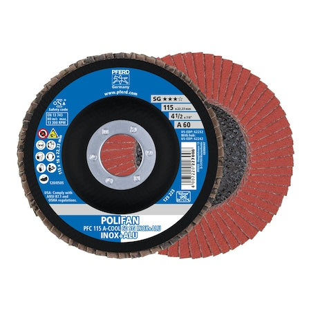 The Pferd Polifan Type 29 SG Flap Disc with MPN 62232 is a top-sized aluminum oxide flap disc. It is ideal for cool grinding on materials with poor thermal conduction such as stainless steel (INOX) and aluminum.