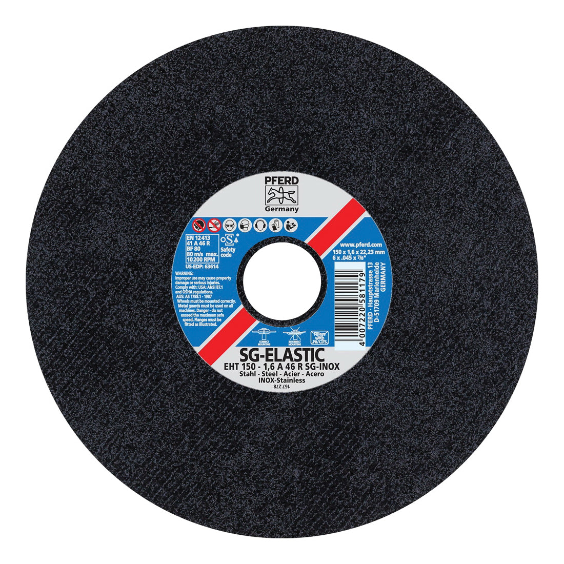 PFERD 63614 is a cut-off wheel from the Performance Line SG-ELASTIC Series. This wheel is designed for cutting various materials like stainless steel, carbon steel, and ferrous metal. It measures six inches in diameter and has a thickness of zero point zero four five inches. The maximum speed is ten thousand two hundred rpm. Suitable for use with angle grinders, this wheel features a seven eighths inch center hole and a grit rating of forty-six.
