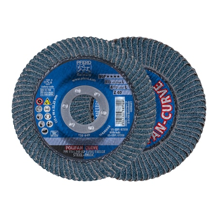 The PFERD 67339 Polifan Steelox Curve Radial Type Flap Disc is designed for optimal grinding performance. This 4-1/2 inch diameter disc with a 7/8 inch arbor hole operates at 13300 RPM and uses 40 grit zirconia alumina for efficient cutting.