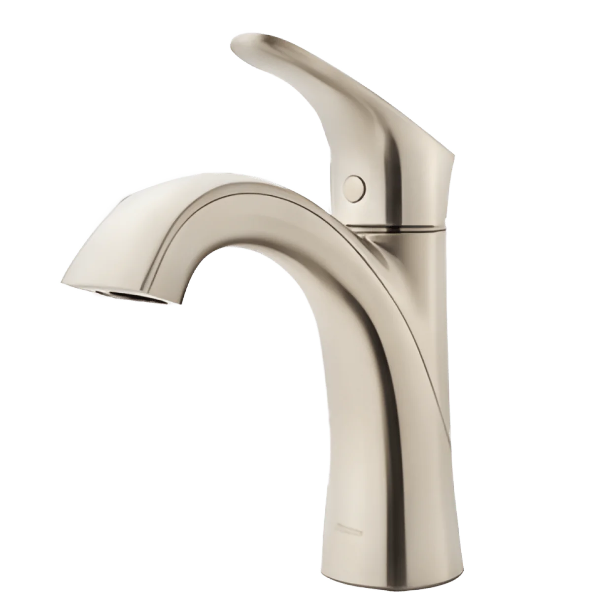 The Pfister Weller faucet, model LG42WR0K, features a single handle design. This bathroom faucet is suitable for centerset installation. Its streamlined design complements various bathroom styles. This model is crafted to meet water-saving standards and ensure a tight seal with its innovative push and seal drain. This faucet is ideal for residential bathroom sinks.