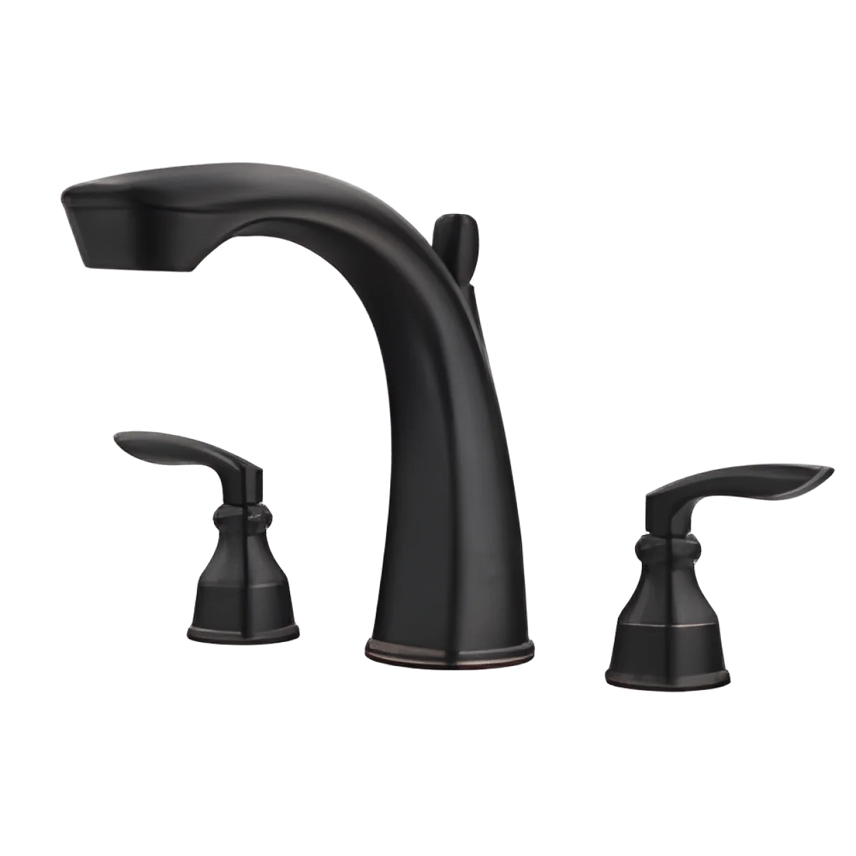 The Pfister Avalon two handle Roman tub faucet model RT65CB1Y is designed for deck mounting and features a high arc spout for ease of use. This faucet meets ADA/ANSI A117.1 standards, ensuring accessibility for all users. The valve body is sold separately and is required for installation.