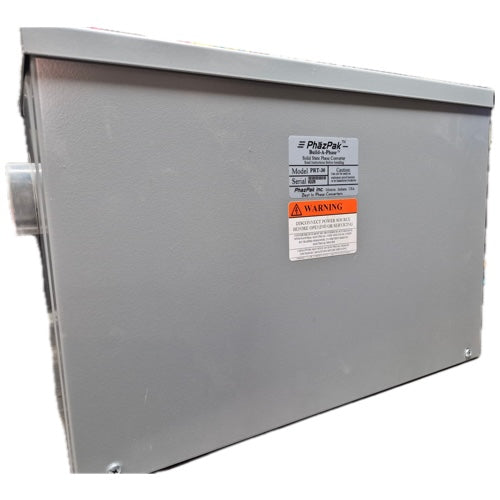 The PHAZPAK PRT-30 is a phase converter that transforms single-phase power into three-phase power. It is ideal for operating three-phase equipment. This device is tailored for motors that use running capacitors and enhances starting torque. The solid-state design eliminates the need for mechanical contacts.