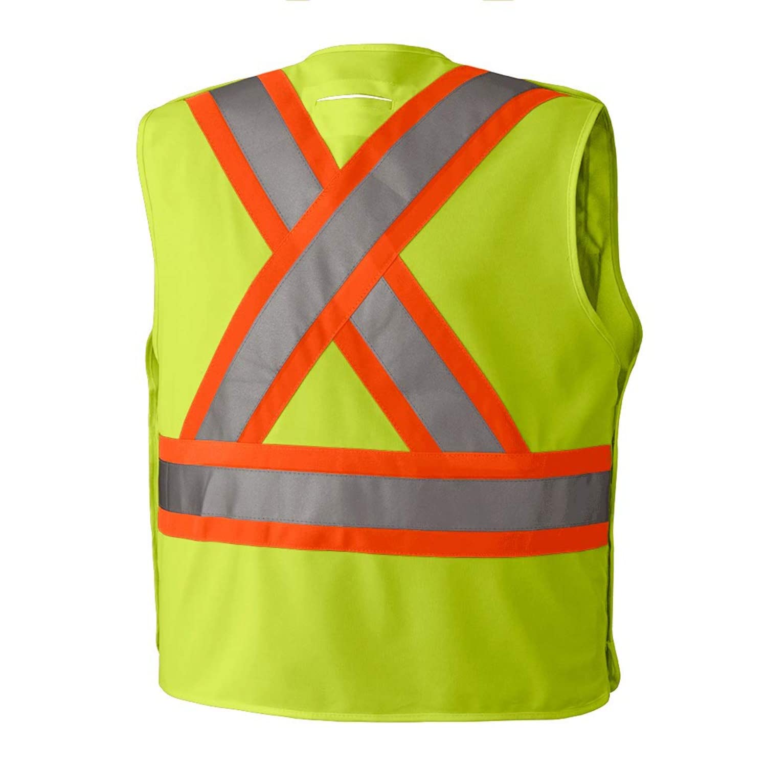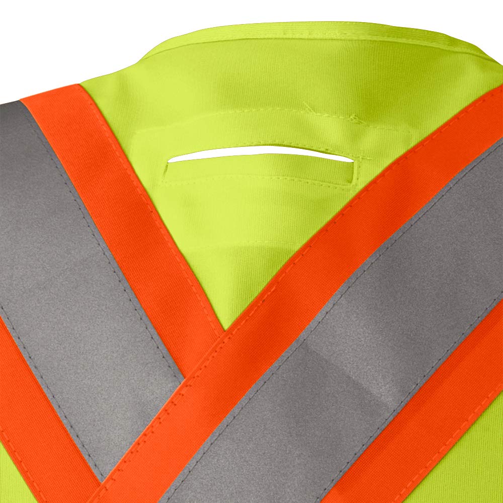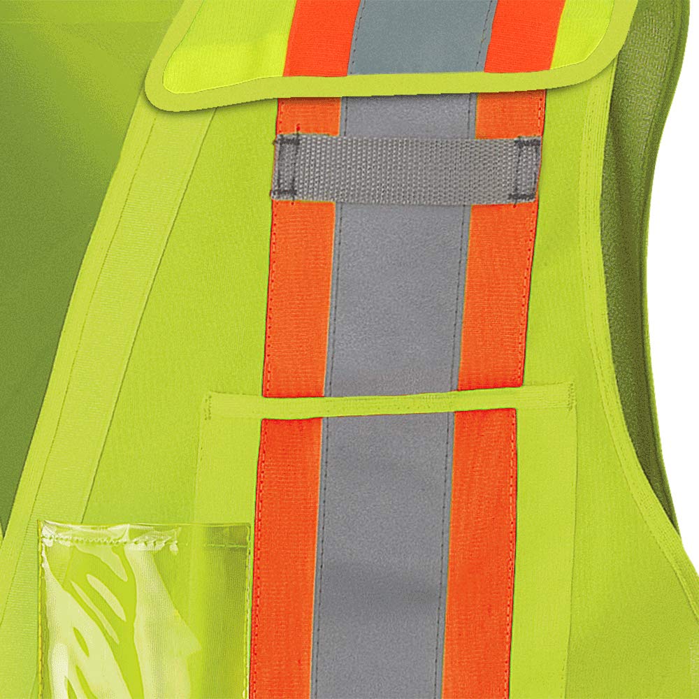 This safety vest provides high visibility with its yellow/green color and StarTech reflective tape, meeting ANSI/ISEA Class 2 requirements for medium-risk traffic control and public safety work. It features four sealed pockets for secure storage, an adjustable front, and a five-point tear-away design for quick emergency removal.