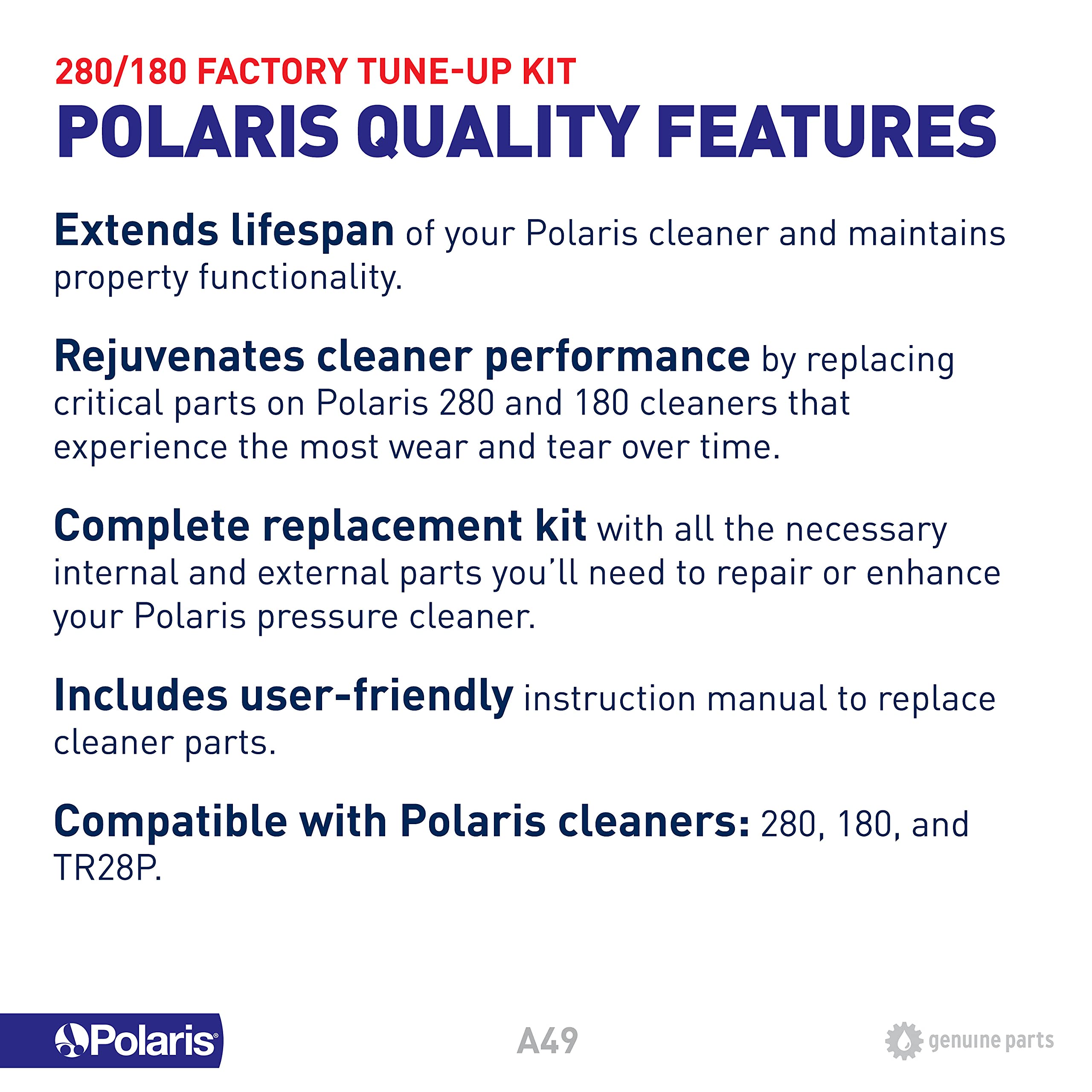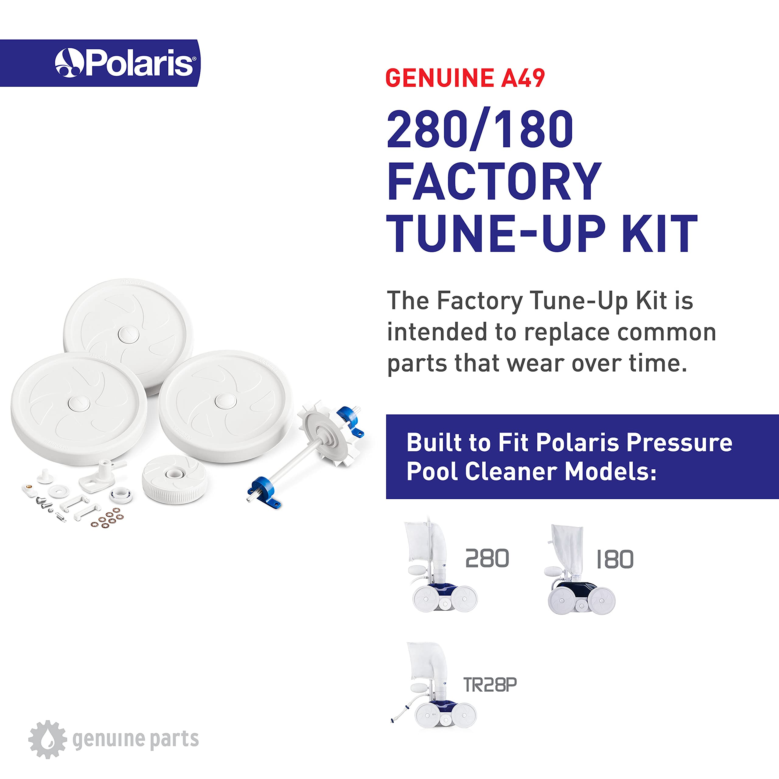 The Polaris A49 Factory Tune-Up Kit is designed for Polaris 280 and 180 pressure-side pool cleaners. This kit is perfect for replacing common parts that experience wear and tear over time.