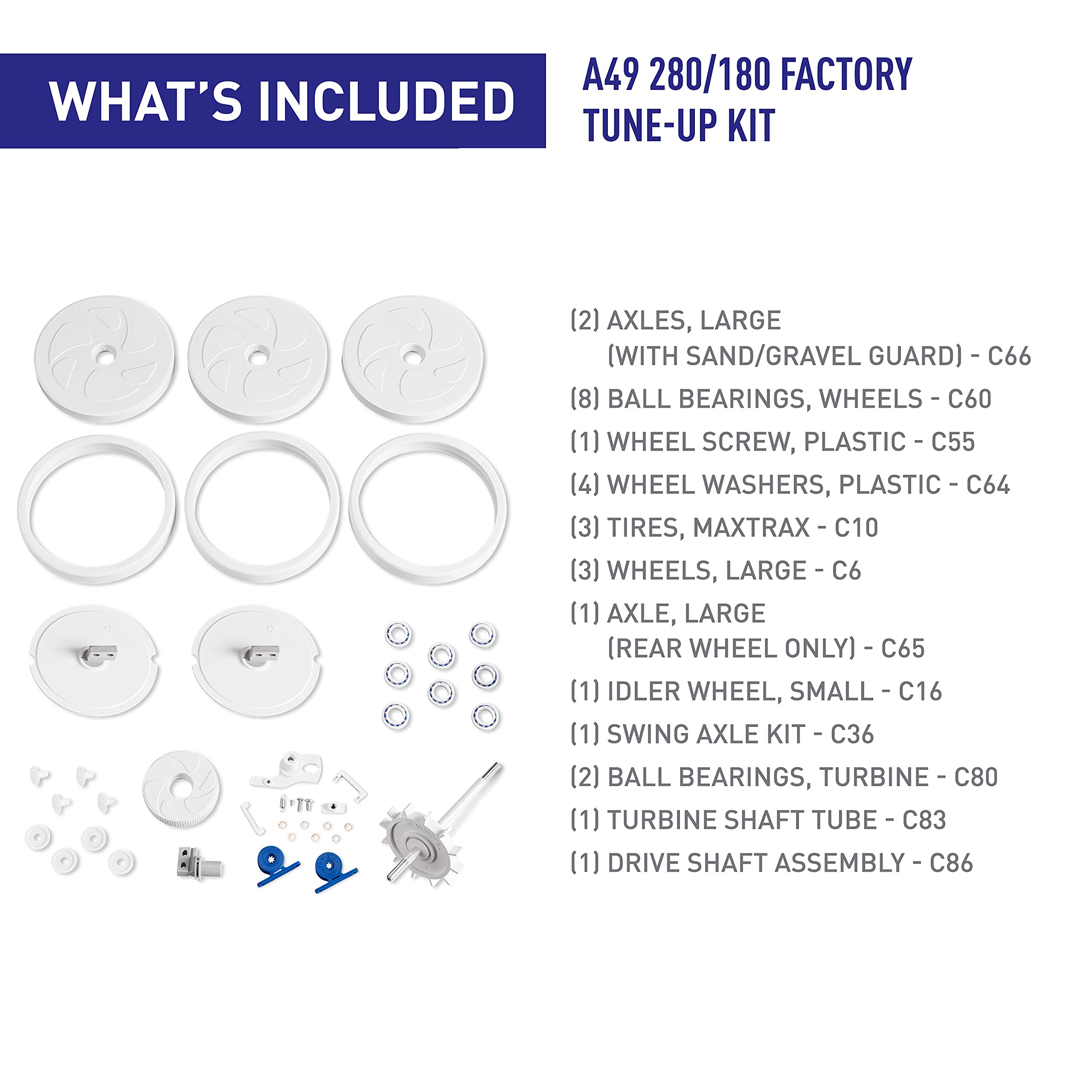 This Polaris A49 Factory Tune-Up Kit helps keep your pool cleaner functioning efficiently. It includes wheels, bearings, axles, and other essential parts to refresh your cleaner.