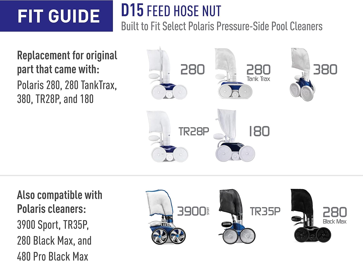 The Polaris D15 Feed Hose Nut Replacement Part is designed for use with pressure-side pool cleaners, compatible with models 280, 280 TankTrax, 380, TR28P, and 180. This genuine Polaris part ensures optimal performance and durability.