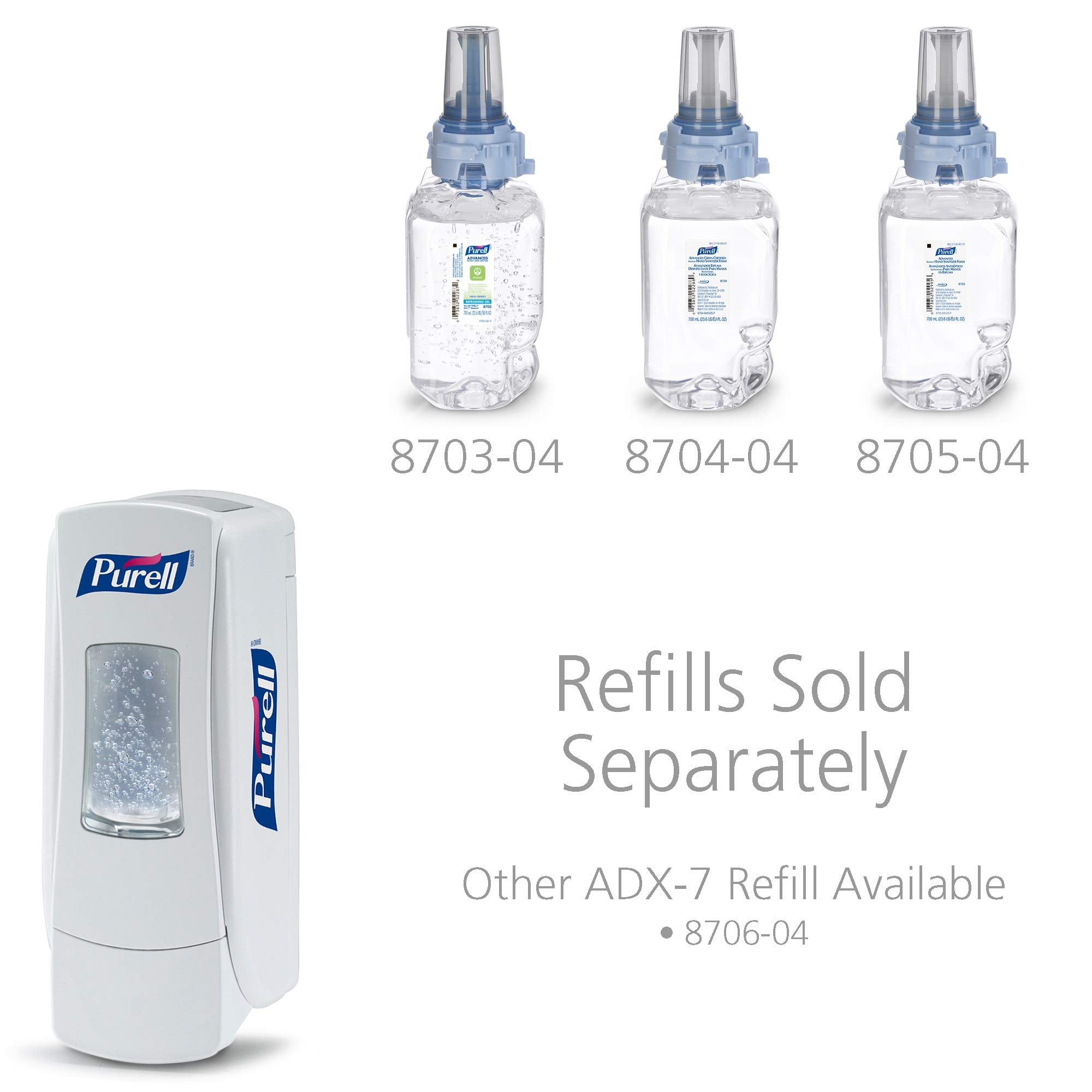 The Purell 8720-06 ADX-7 Push-Style Hand Sanitizer Dispenser comes in white and is designed for 700 mL refills. This manual push dispenser is ideal for smaller spaces. It controls portions dispensed to help reduce waste and easily converts to a locked dispenser.