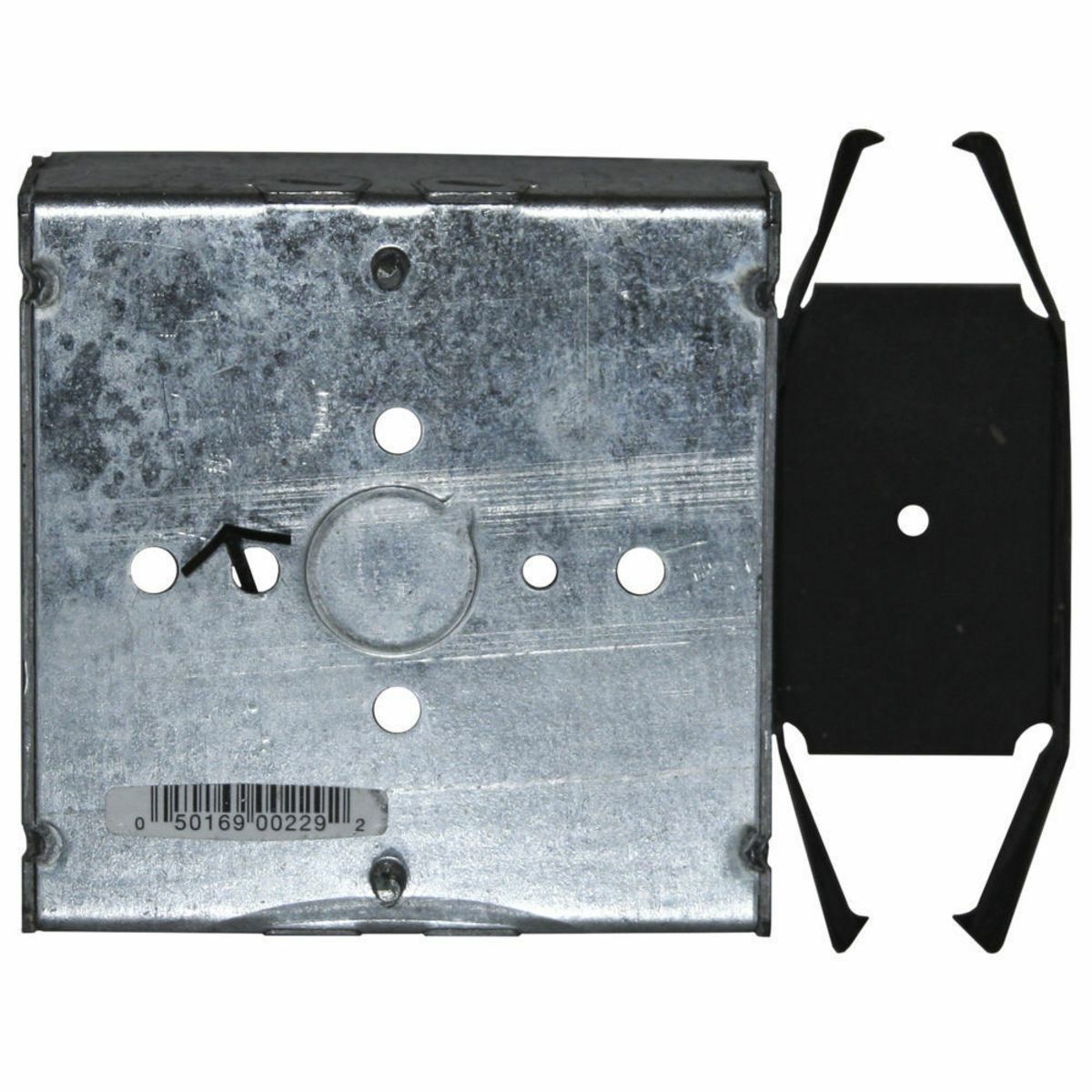 The RACO brand square box, MPN 229, is a welded steel electrical box designed for electrical applications. It has a cubic capacity of twenty-one cubic inches and features eight knockouts. This model is suitable for flush mounting and includes an adjustable BOX-LOC bracket for easy installation.