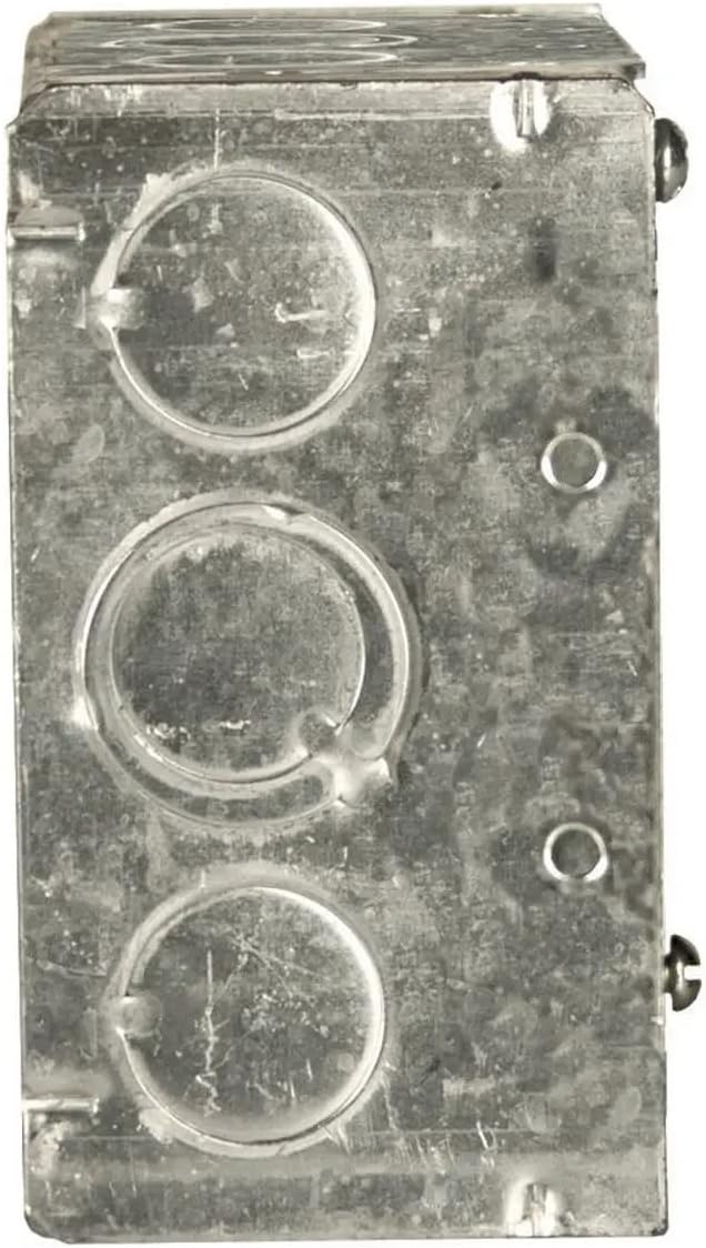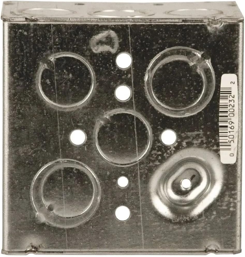 The Raco Square Electrical Box, model number 232, is designed for electrical installations. This box is four inches in width and two and one-eighth inches deep. It has a capacity of thirty point three cubic inches. The box includes half-inch and three-quarter-inch knockouts for conduit entry, providing versatility in wiring configurations.