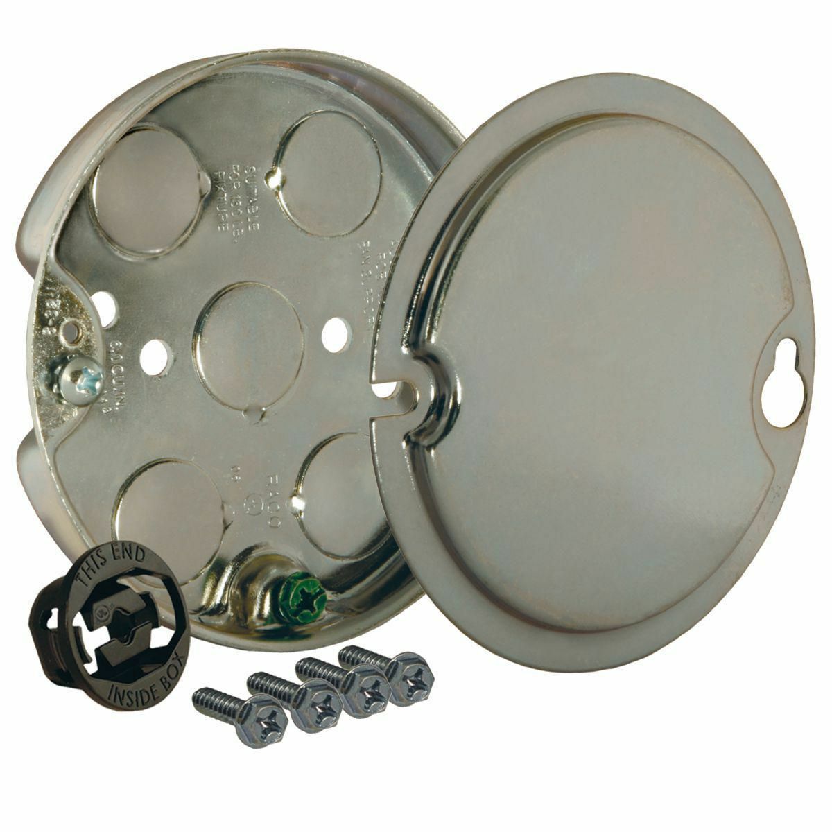 The Raco 295 is a four-inch round ceiling fan support pan designed to securely hold ceiling fans and lighting fixtures. This pan is made of steel and features a depth of one-half inch with four knockouts, allowing for various electrical connection options.