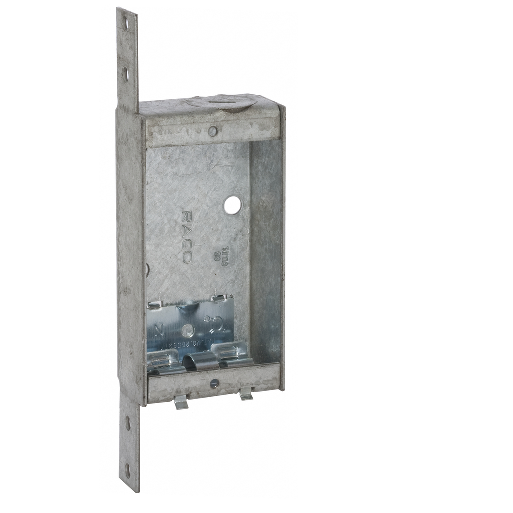 The Raco 404 is a nongangable switch box designed for housing electrical devices. This model features dimensions of three and three-fourths inches by two inches, with a depth of one inch. Suitable for various installations, this switch box includes one half-inch knockout and NMSC clamps.