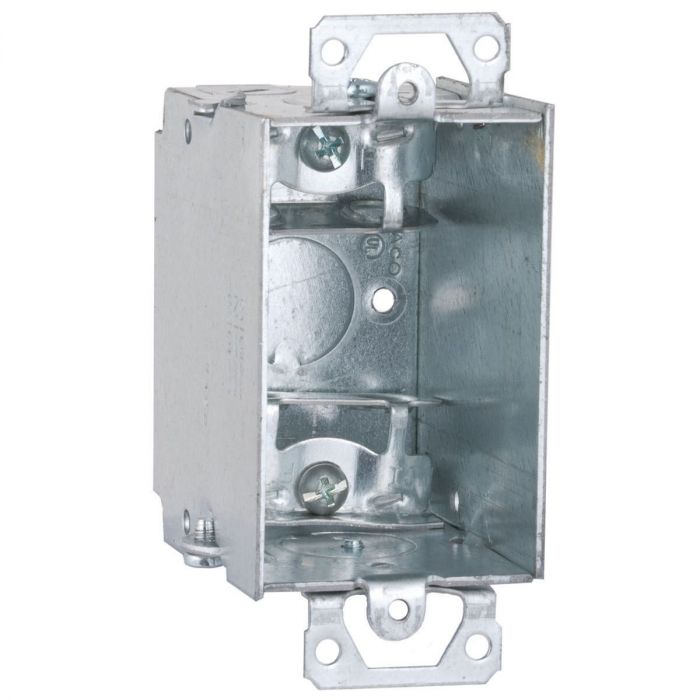 The RACO gangable switch box, model 518, is designed for electrical installations. It has a depth of two and a half inches and comes with plaster ears for secure mounting. This switch box can accommodate multiple devices and has a capacity of twelve point five cubic inches.