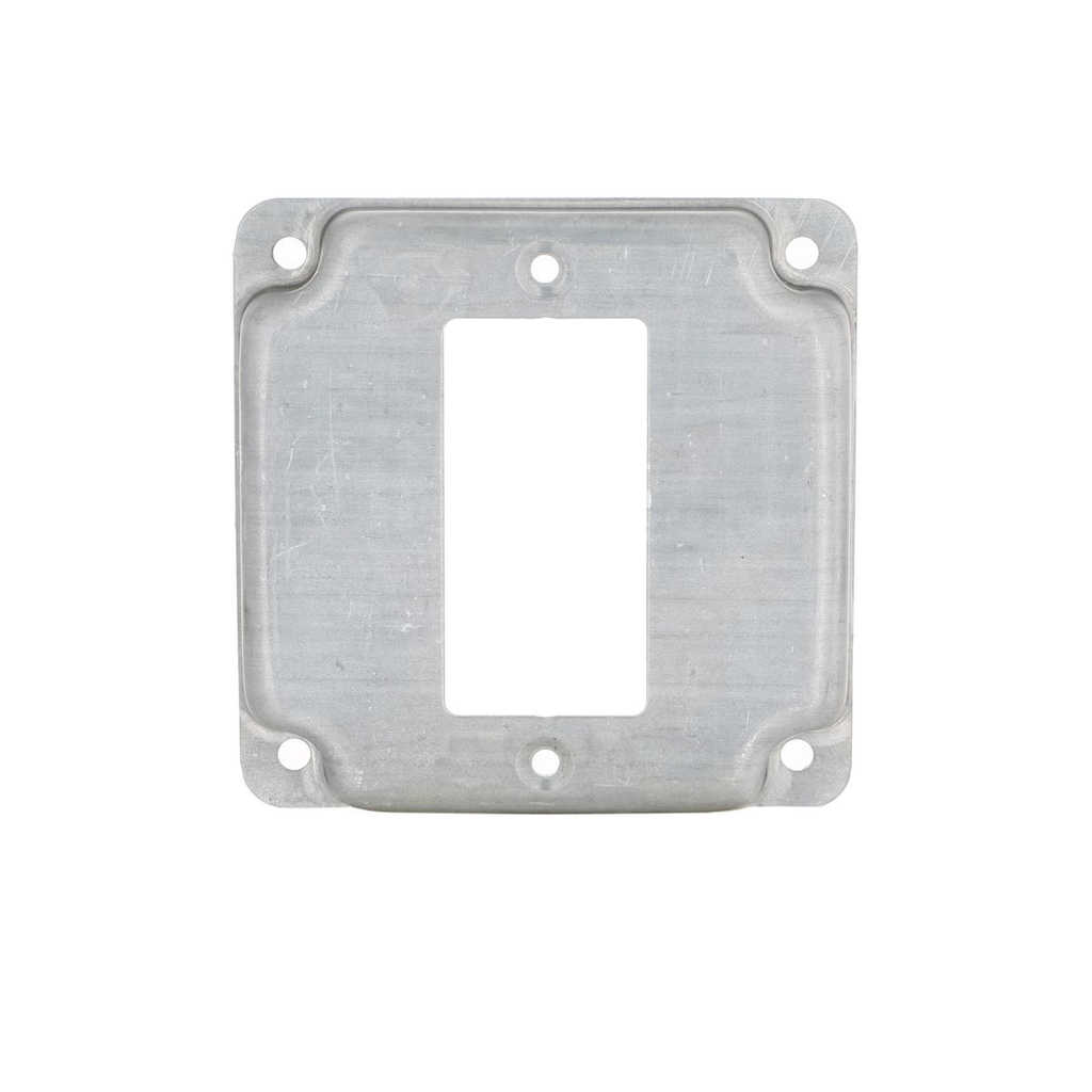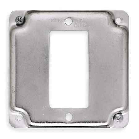 The Raco 808C is a durable square receptacle cover designed for use with one GFCI outlet. It measures four inches by four inches and has a depth of one-half inch. This cover is made of galvanized steel, offering a strong and reliable solution for exposed work areas.