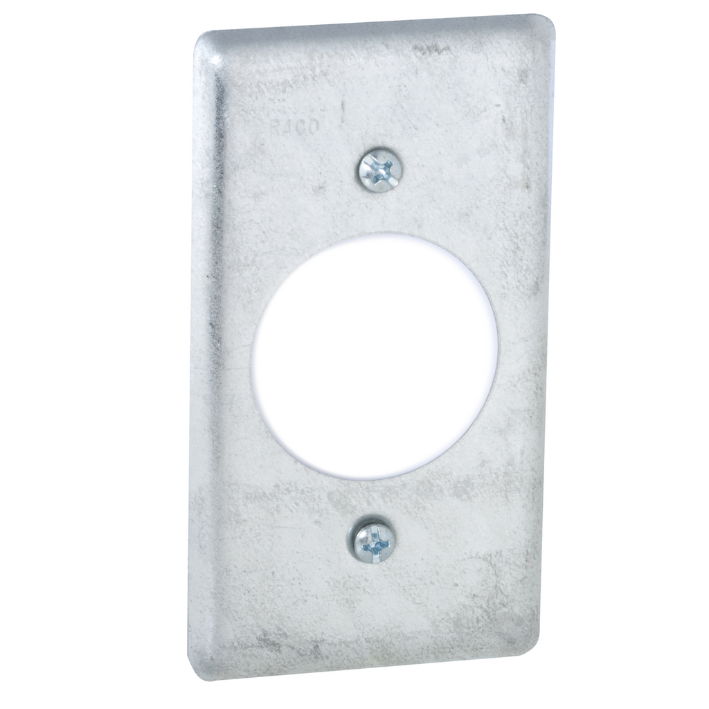 The RACO 867 Flat Handy Box Cover is designed for use with electrical wiring applications. This cover measures four and three sixteenths inches in length and two and five sixteenths inches in width. It is constructed from pre-galvanized steel for durability and protection against wear. The handy box cover is compatible with 20 amp receptacles, making it suitable for various electrical configurations.