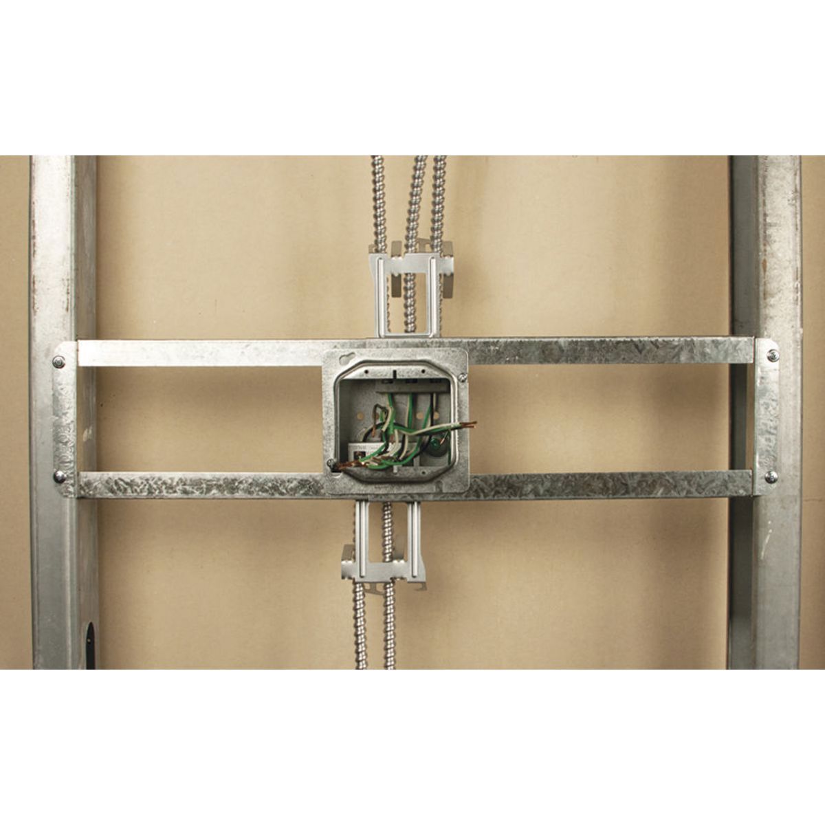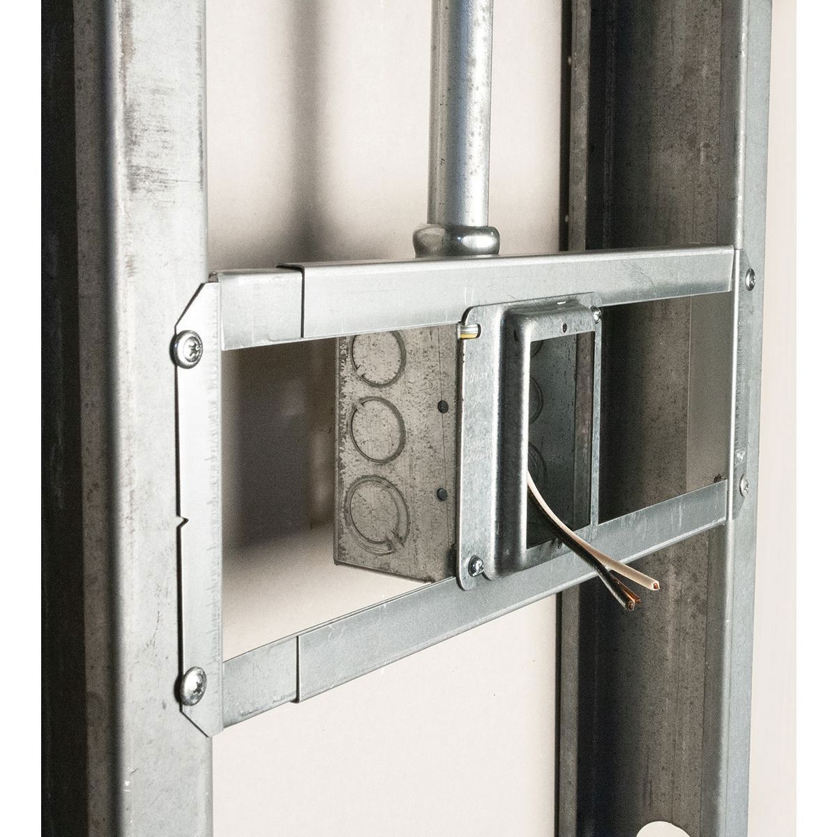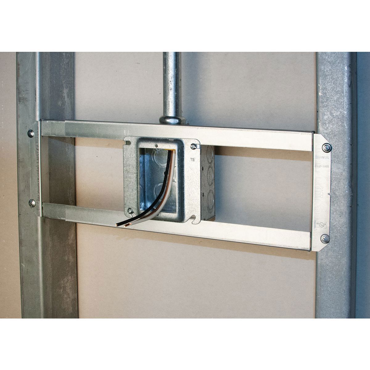 Applications: Adjustable Open Center Bracket adjusts from 16 inches to 24 inches for mounting boxes between metal and wood studs